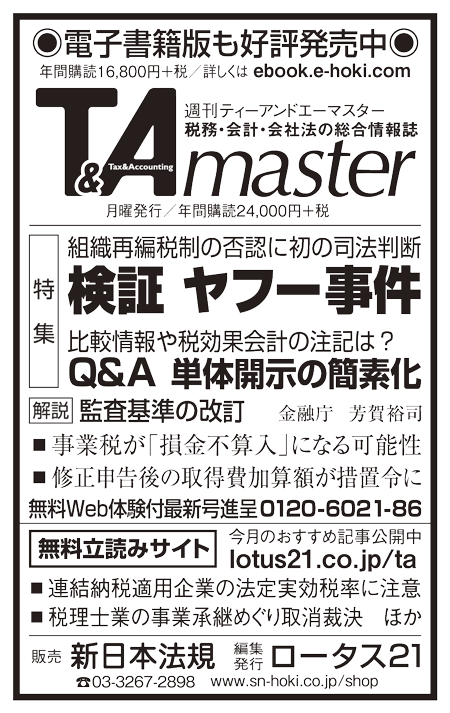税務・会計・会社法は目まぐるしく改正され、更に複雑に関連しています。このため、従来の単独分野の専門誌では、実務上の対応が遅れてしまうのが現状です。3分野の個々の情報をお伝えするとともに、それらの関連を明らかにするT&Amasterは、今までにない一歩先を行く専門誌です。