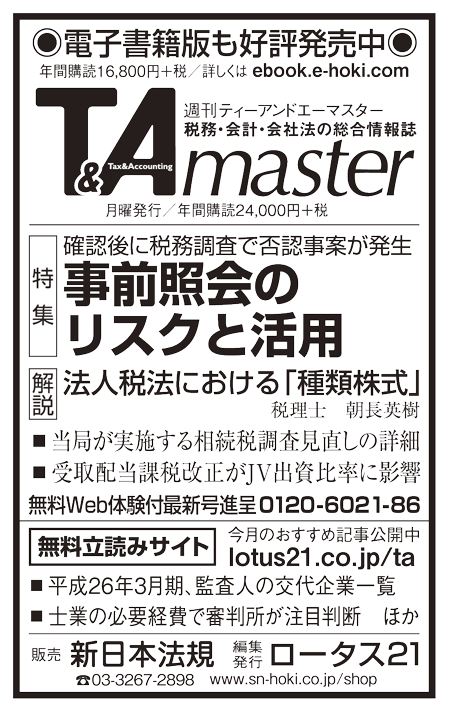 税務・会計・会社法は目まぐるしく改正され、更に複雑に関連しています。このため、従来の単独分野の専門誌では、実務上の対応が遅れてしまうのが現状です。3分野の個々の情報をお伝えするとともに、それらの関連を明らかにするT&Amasterは、今までにない一歩先を行く専門誌です。